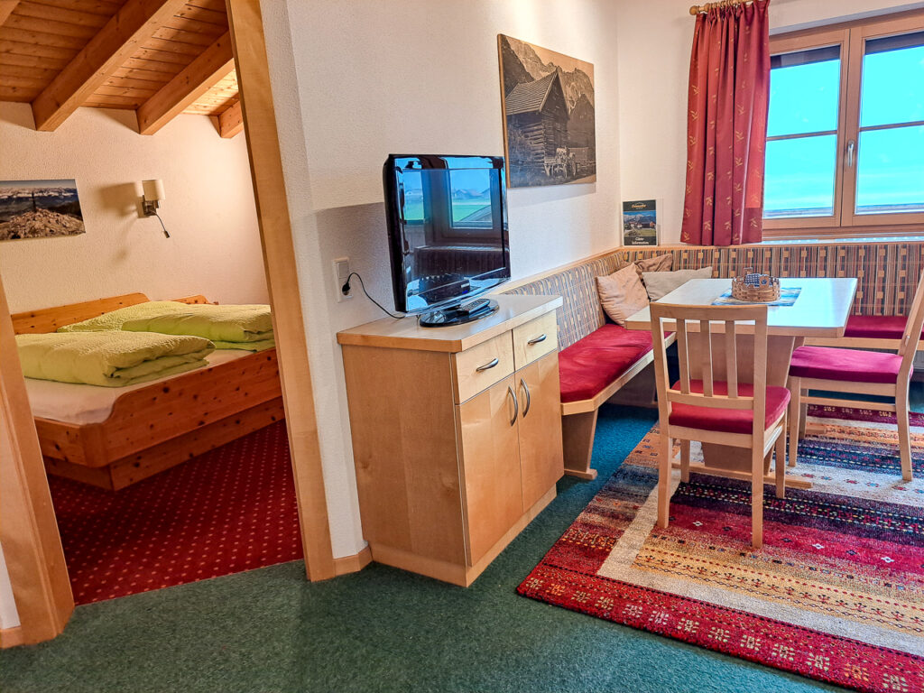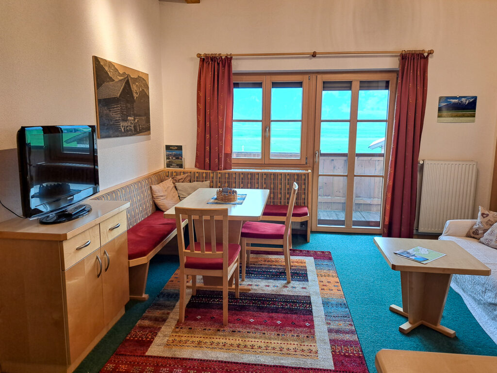 In der nach Süden ausgerichteten Ferienwohnung “Pirchkogel” liegen Ihnen die schönen und weitläufigen Wiesen zu Füßen. Ausgelegt für 4 bis 5 Personen ist die großzügige Wohnung mit einer Couch und einem Fernseher ausgestattet. Das Bad, mit Dusche/WC und Föhn, sorgt mit Bodenheizung für ein wohliges Gefühl. Ihre Wertgegenstände können Sie sicher im Zimmersafe verwahren, während Sie die Region erkunden. Von Ihrem Balkon aus genießen Sie den Blick auf den markanten Pirchkogel.