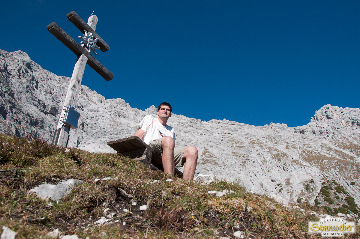 Ausgangspunkt ist der Parkplatz am nörldlichen Dorfrand der Nachbar-Gemeinde Wildermieming. Dort folgt man dem Ochsenbründlsteig zur Neuen Alplhütte. Hier folgt man der Beschilderung “Wetterkreuz”. Bereits dort hat mein einen schönen Blick auf das Inntal, insbesondere auf die Marktgemeinde Telfs. Folgt man dem Pfad weiter nordwärts, errreicht man eine Weggabelung. Wir wollen auf den Karkopf und zweigen hier rechts ab. Nach links ginge auf die “Hohe Wand”, welche jedoch etwas mehr Kondition und Trittsicherheit verlangt. Hier kommen wir recht bald in felsiges Gelände. Dies ist jedoch nach einer kurzen Eingewöhnungszeit ohne Probleme zu bewältigen. Dabei wird fast der komplette Bergrücken Richtung Osten umwandert bevor man sich wieder dem Gipfel nähert. Am Gipfel wird man mit einem grandiosen Ausblick belohnt. Im Süden auf das Inntal, Gurgltal und Mieminger Plateau. Und im Norden die Leutasch und das Gaistal mit seinen Almen. Auch die Zugspitze – Deutschlands höchster Berg – ist in der Ferne gut auszumachen.